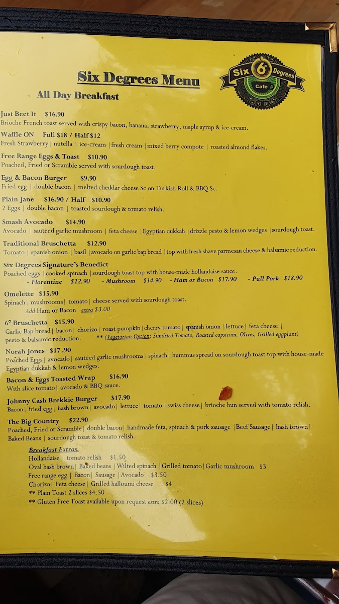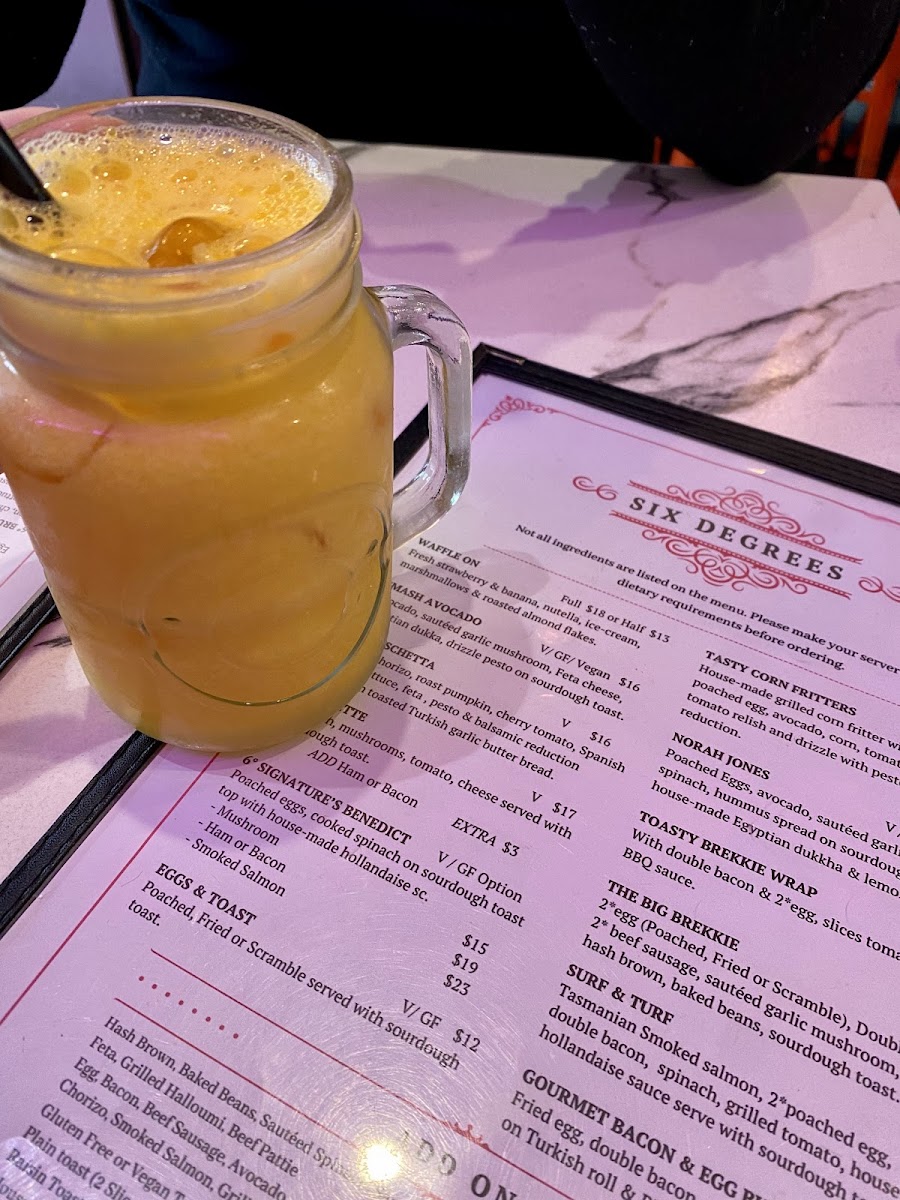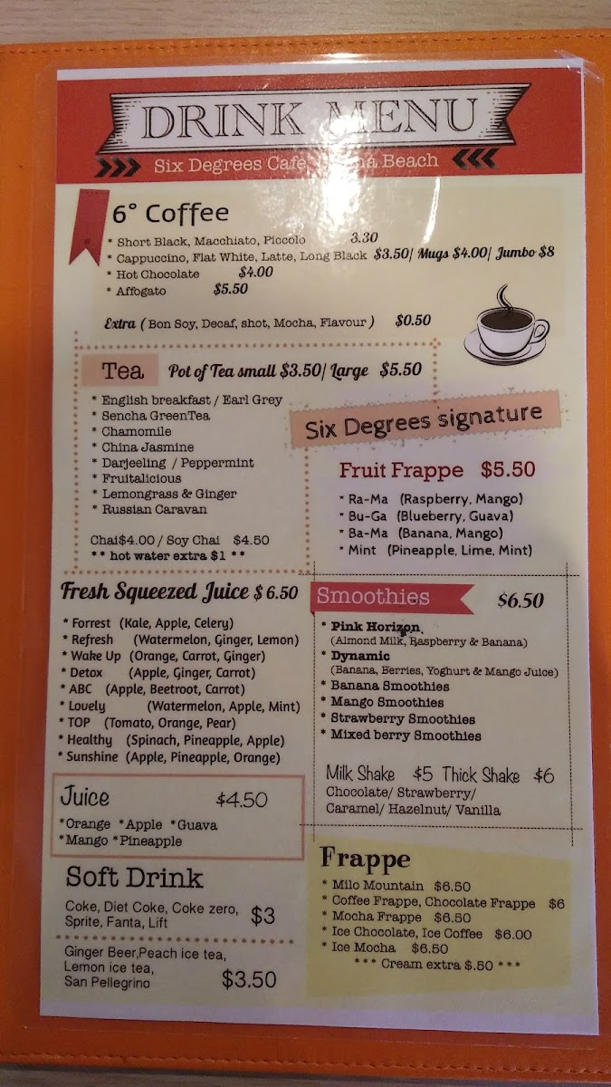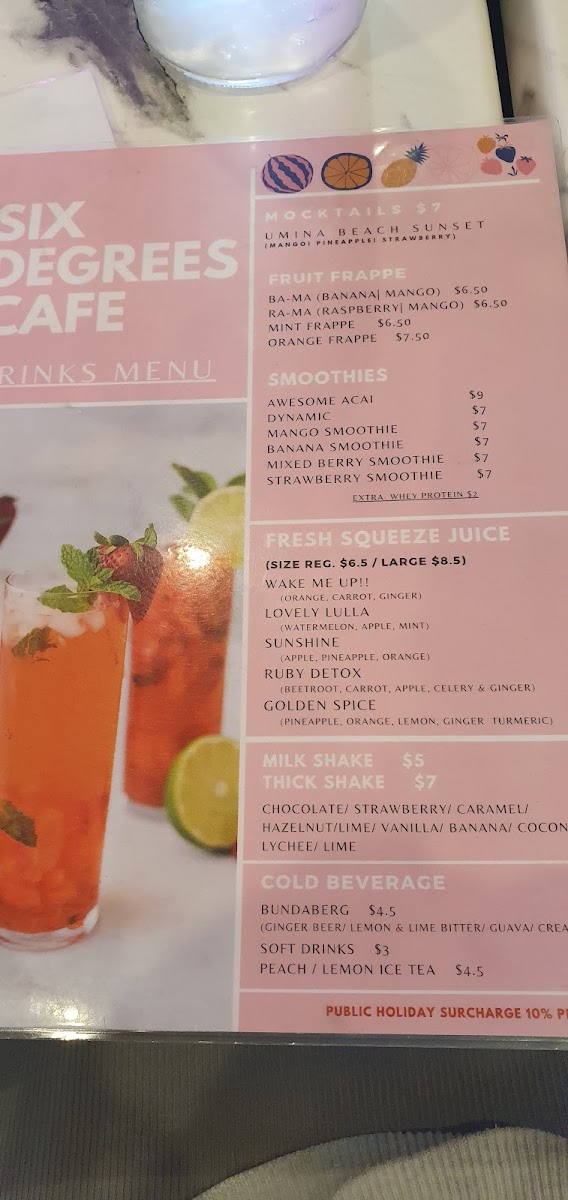 The beverage menu adds another strong layer to the overall offering. Refreshing non-alcoholic choices such as the mocktail Umina Beach Sunset bring a coastal vibe, while fruit-based drinks like the Ba-Ma, Ra-Ma, Mint Frappe, Orange Frappe, and smoothies including Awesome Acai, Dynamic, Mango Smoothie, Banana Smoothie, and Mixed Berry Smoothie provide lighter, health-conscious alternatives. Fresh squeeze juices such as Lovely Lulla, Sunshine, Wake Me Up, Ruby Detox, and Golden Spice further reinforce the café’s focus on freshness. For all-day dining, breakfast options like Waffle On, Tasty Corn Fritters, Norah Jones, 6° Bruschetta, and Smash Avocado ensure guests can enjoy breakfast favorites at any time. Complemented by drink specials such as Orange Frappe, Soy Chai Frappe, Coconut Milk Shake, and Cold Brew Coffee, alongside familiar cold beverages like Bundaberg, Coke, Coke Zero, Sprite, Fanta, and Ginger Beer, the menu ultimately feels complete, flexible, and thoughtfully curated-making Six Degrees Cafe a reliable and enjoyable choice for both locals and visitors alike.
