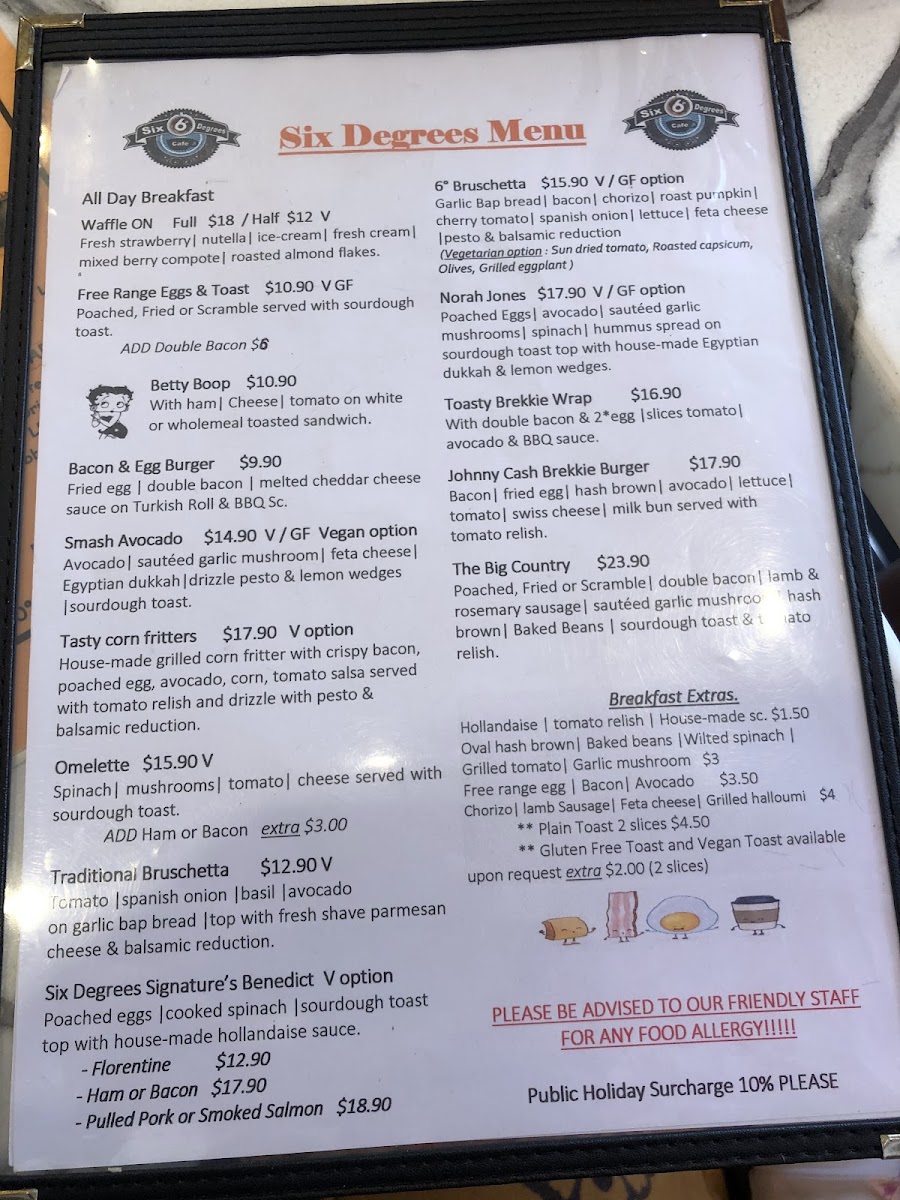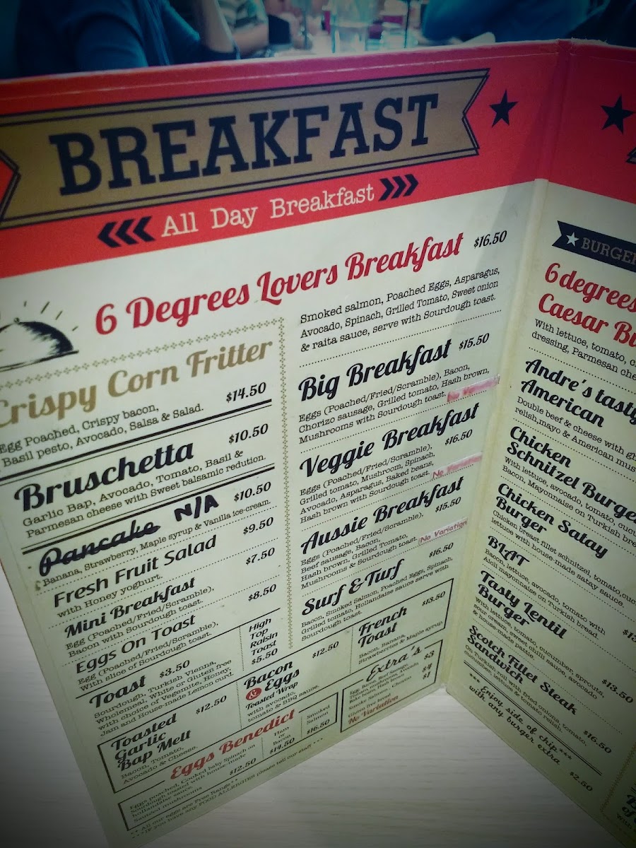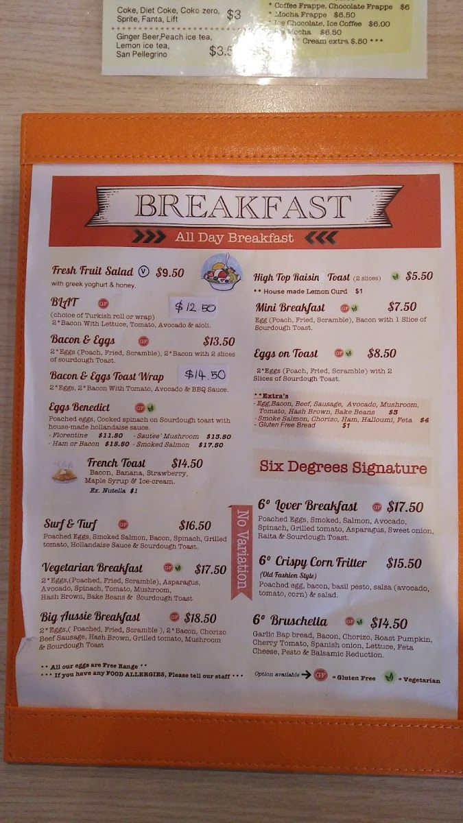 The beverage menu adds another strong layer to the overall offering. Refreshing non-alcoholic choices such as the mocktail Umina Beach Sunset bring a coastal vibe, while fruit-based drinks like the Ba-Ma, Ra-Ma, Mint Frappe, Orange Frappe, and smoothies including Awesome Acai, Dynamic, Mango Smoothie, Banana Smoothie, and Mixed Berry Smoothie provide lighter, health-conscious alternatives. Fresh squeeze juices such as Lovely Lulla, Sunshine, Wake Me Up, Ruby Detox, and Golden Spice further reinforce the café’s focus on freshness. For all-day dining, breakfast options like Waffle On, Tasty Corn Fritters, Norah Jones, 6° Bruschetta, and Smash Avocado ensure guests can enjoy breakfast favorites at any time. Complemented by drink specials such as Orange Frappe, Soy Chai Frappe, Coconut Milk Shake, and Cold Brew Coffee, alongside familiar cold beverages like Bundaberg, Coke, Coke Zero, Sprite, Fanta, and Ginger Beer, the menu ultimately feels complete, flexible, and thoughtfully curated-making Six Degrees Cafe a reliable and enjoyable choice for both locals and visitors alike.